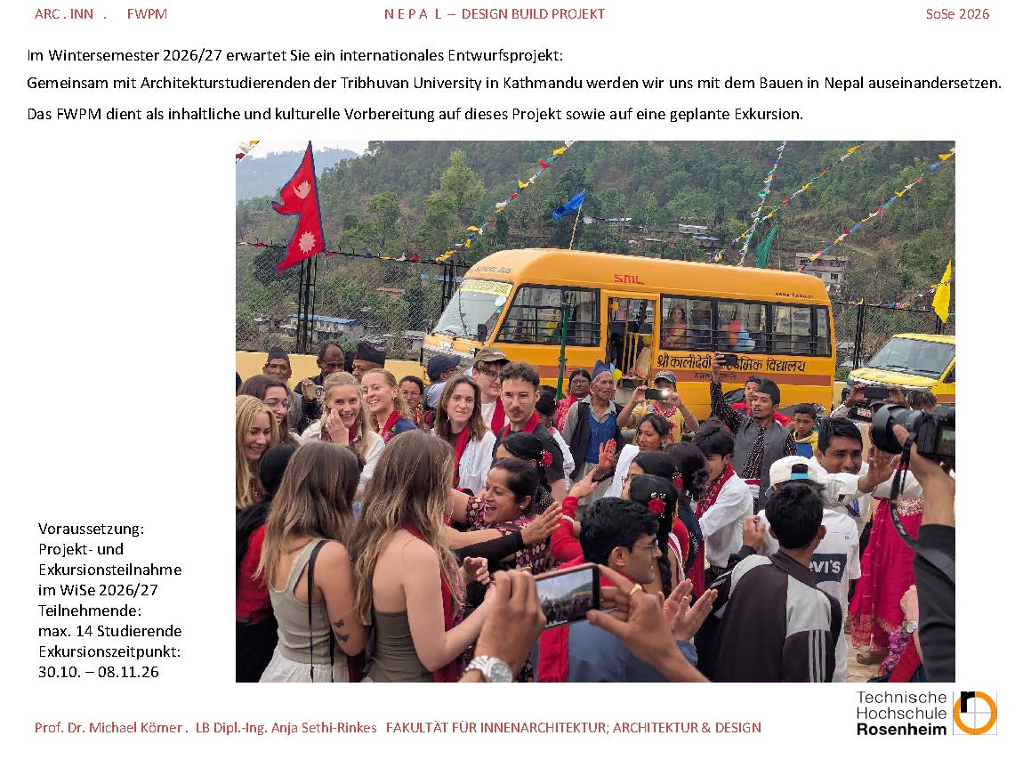 Das FWPM dient als inhaltliche und kulturelle Vorbereitung auf dieses Projekt sowie auf eine geplante Exkursion. Im Mittelpunkt steht die Auseinandersetzung mit den Menschen, den lokalen Bautraditionen und der spezifischen Bauweise der Region. Gemeinsam untersuchen wir, wie in Nepal und den umliegenden Regionen gebaut wird und welche konstruktiven Strategien eingesetzt werden, um auf Klima und Witterung zu reagieren.